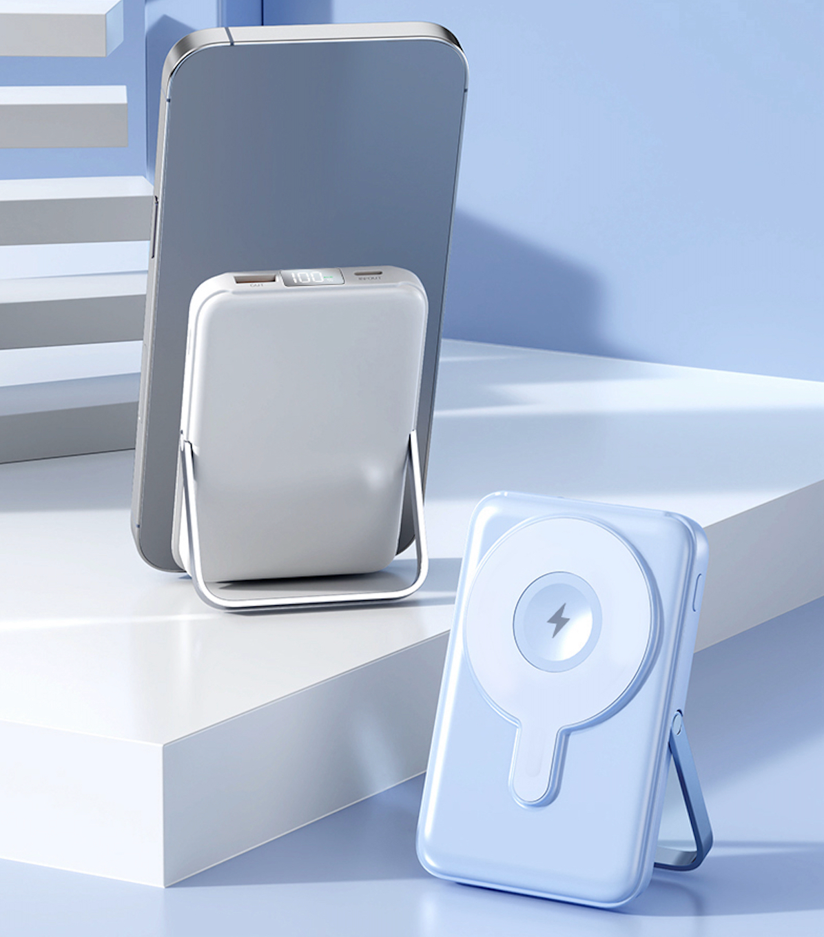 Dodatki: Wbudowana podstawka do telefonu, mocowanie magnetyczne (kompatybilne z MagSafe), i krótki kabel typu C.